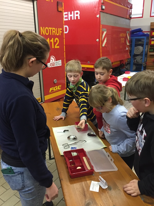 Nun ging es in die Fahrzeughalle, wo die Kinder in zwei Gruppen nach einer Vorführung und Sicherheitsunterweisung selbst verschiedenste Materialien und Stoffe unter Aufsicht auf ihre Brennbarkeit testen konnten. Ebenfalls sollten sie aufpassen, wie schnell und in welcher Farbe die verschiedenen Gegenstände brennen würden. Überrascht waren die Kids von der sehr schnellen Entzündung und Brandausbreitung von trockenem Heu oder Stroh, welches man überall auf Bauernhöfen und Feldern im Sommer anfindet.