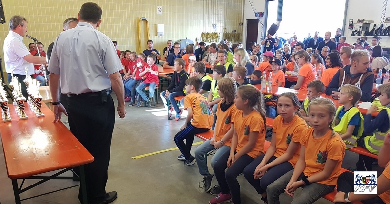 Alle teilnehmenden Kinderfeuerwehren erhielten aus den Händen von 1. Bürgermeister Bernd Hofmann, Kreisbrandrat Wieland Schletz und 1. Kommandant Rainer Voith die Siegerpokale überreicht.